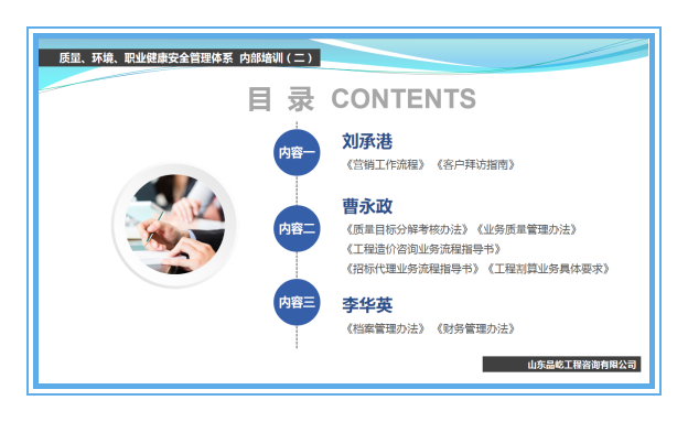管理体系在公司运行两年有余,为了顺应外部环境及公司内部发展变化,管理层会议研究讨论对体系文件进行了系统的修订换版。本次培训是由项目管理一、二部经理曹永政、刘承港,财务部经理李华英三位讲师搭档完成,他们结合工作所需及文件调整变化,按下图分工详细展开讲解。